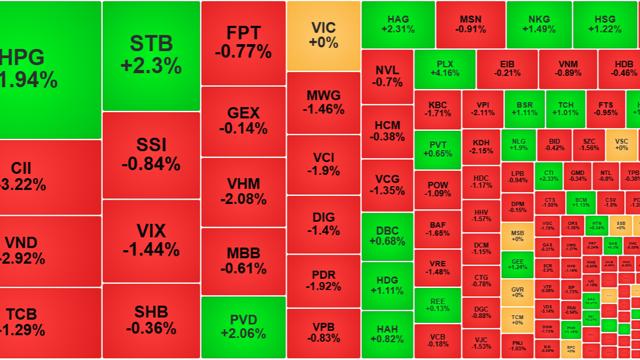 Ở phía giảm, tình thế khá bi đát. Dù VN-Index giảm rất nhẹ nhưng có tới 107 mã đang mất hơn 1% giá trị. Nhóm này đang chiếm xấp xỉ 37% tổng thanh khoản sàn HoSE. Ngoài một số blue-chips như TCB, VHM, MWG, rất nhiều mã tầm trung đang lao dốc với thanh khoản cao như CII giảm 3,22%, VND giảm 2,92%, VIX giảm 1,44%, VCI giảm 1,9%, DIG giảm 1,4%, PDR giảm 1,92%. Các mã này đều khớp vượt ngưỡng trăm tỷ đồng. Các cổ phiếu này đều bị đánh tụt khỏi giá đỉnh với biên độ lớn.