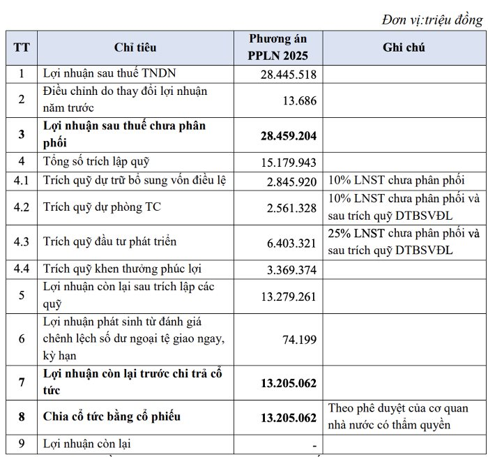 Cụ thể, lợi nhuận sau thuế năm 2025 đạt 28.445 tỷ đồng, sau điều chỉnh nâng tổng lợi nhuận chưa phân phối lên 28.459 tỷ đồng. Ngân hàng dự kiến trích lập các quỹ với tổng giá trị hơn 15.179 tỷ đồng, bao gồm quỹ dự trữ bổ sung vốn điều lệ, quỹ dự phòng tài chính, quỹ đầu tư phát triển và quỹ khen thưởng phúc lợi.