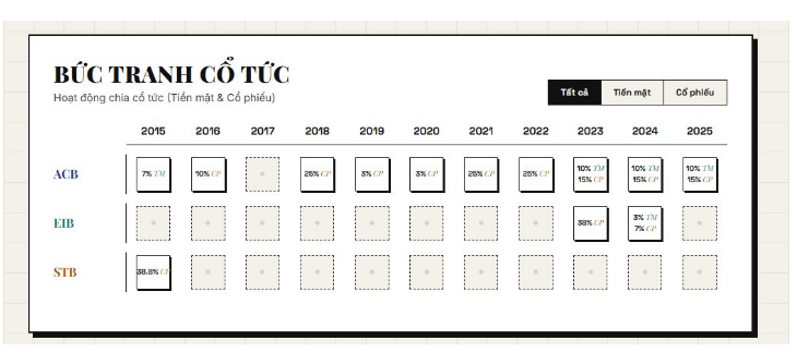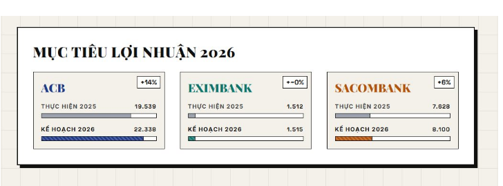 Về cổ tức, ACB đề xuất chia cổ tức tỷ lệ 20% trong năm nay, trong đó chia cổ tức tiền mặt tỷ lệ 7% và bằng cổ phiếu tỷ lệ 13%. Eximbank không chia cổ tức vì mục đích củng cố năng lực tài chính để tăng trưởng và phát triển bền vững. Trong khi cổ tức với cổ đông Sacombank là chuyện khó xảy ra trong năm 2026 và thậm chí là nhiều năm tới khi ngân hàng đang muốn gia hạn đề án tái cơ cấu đến 2030.