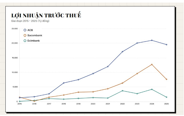 ACB, Sacombank và Eximbank ngày nay đã đi theo ba quỹ đạo phát triển hoàn toàn khác biệt. Sức khỏe tài chính, khả năng sinh lời và vị thế quy mô của mỗi ngân hàng, xét đến cùng, chịu tác động sâu sắc từ mức độ ổn định trong cấu trúc quản trị và năng lực điều hành của đội ngũ lãnh đạo.