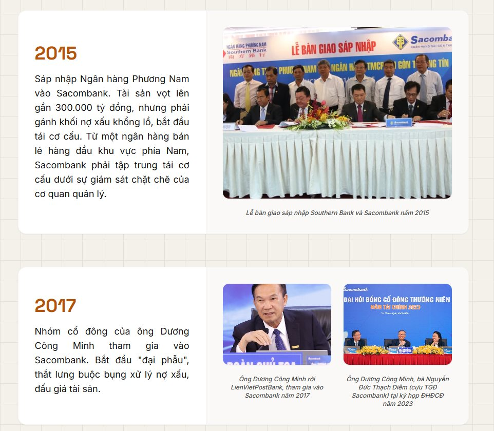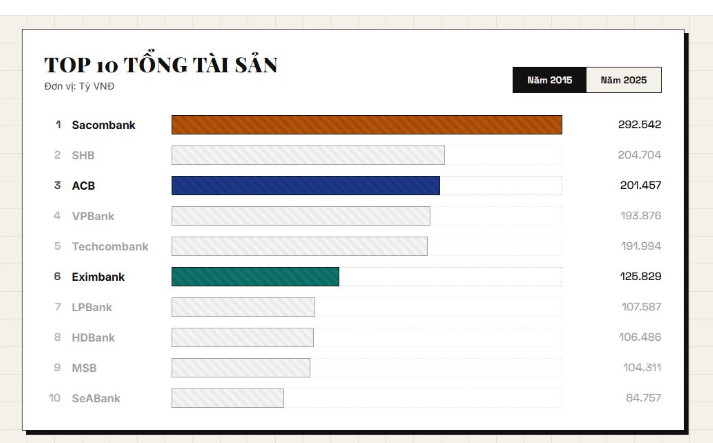 Năm 2015, sau khi nhận sáp nhập Ngân hàng Phương Nam, Sacombank có tổng tài sản hơn 292 nghìn tỷ đồng, cao nhất trong các ngân hàng tư nhân và vượt trội hơn hẳn các nhà băng còn lại, gấp rưỡi SHB, ACB, VPBank, Techcombank ở thời điểm đó. Còn năm 2025, Sacombank tụt xuống còn vị trí thứ 5, không chỉ đứng sau VPBank, Techcombank, ACB mà còn đứng sau HDBank.