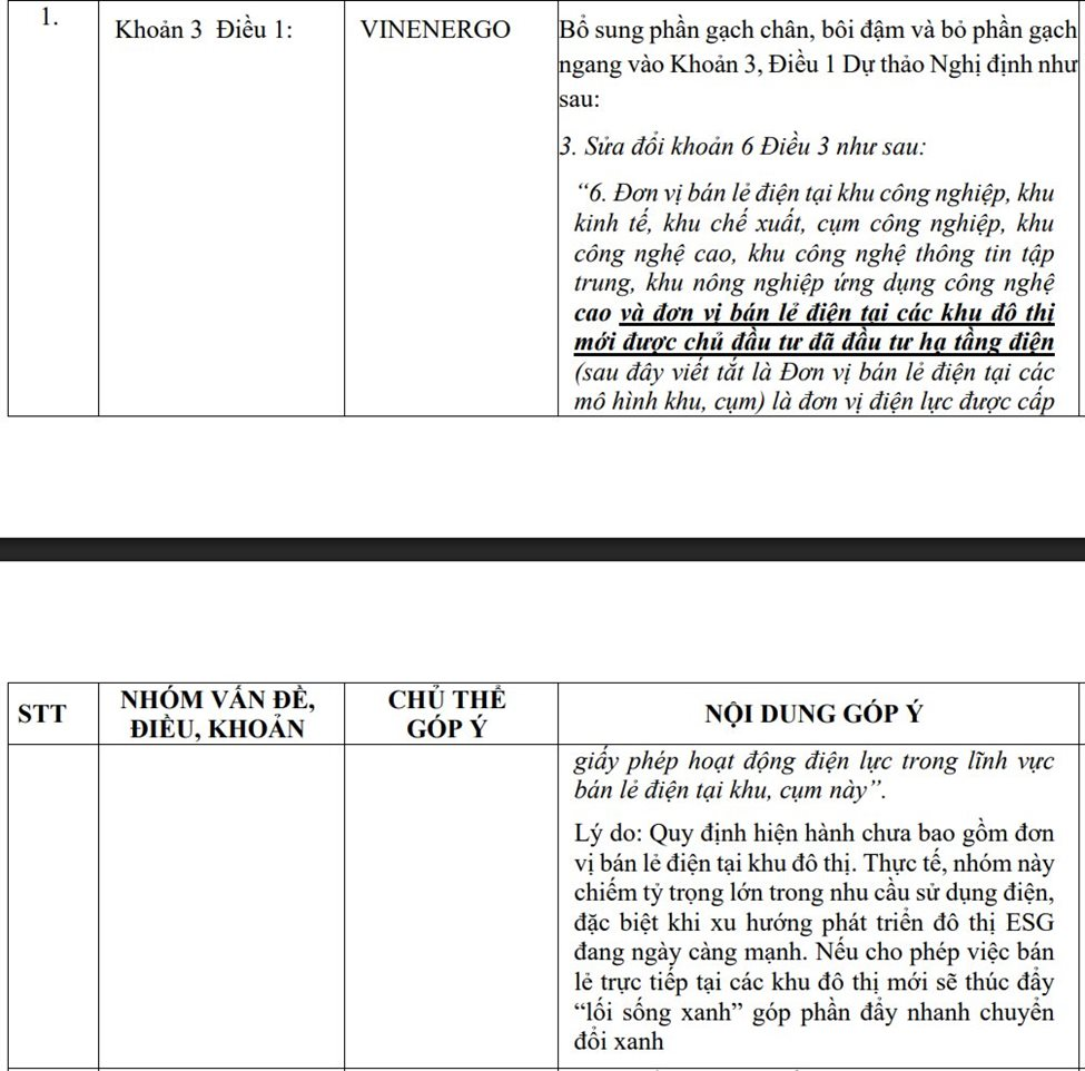 Nói riêng về khu đô thị, VinEnergo đề xuất bổ sung thêm bán lẻ điện tại khu đô thị vào quy định. Quy định hiện tại cho phép việc này với đơn vị bán lẻ điện tại khu công nghiệp, khu kinh tế, khu chế xuất, cụm công nghiệp, khu công nghệ cao, khu công nghệ thông tin tập trung, khu nông nghiệp ứng dụng công nghệ cao.