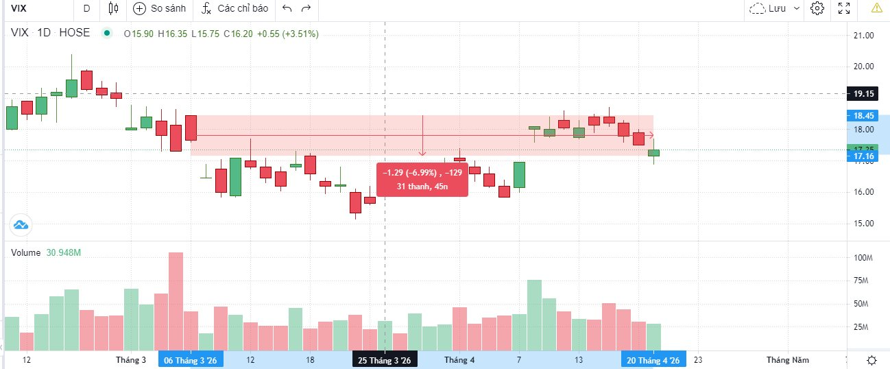 Ở góc độ kỹ thuật, xu hướng giảm chỉ có thể bị phá vỡ khi VIX vượt dứt khoát vùng kháng cự 18,5 đi kèm thanh khoản cải thiện. Ngược lại, nếu đánh mất vùng hỗ trợ 17, cổ phiếu có thể tiếp tục lùi về các vùng giá thấp hơn đã thiết lập trong tháng 3.