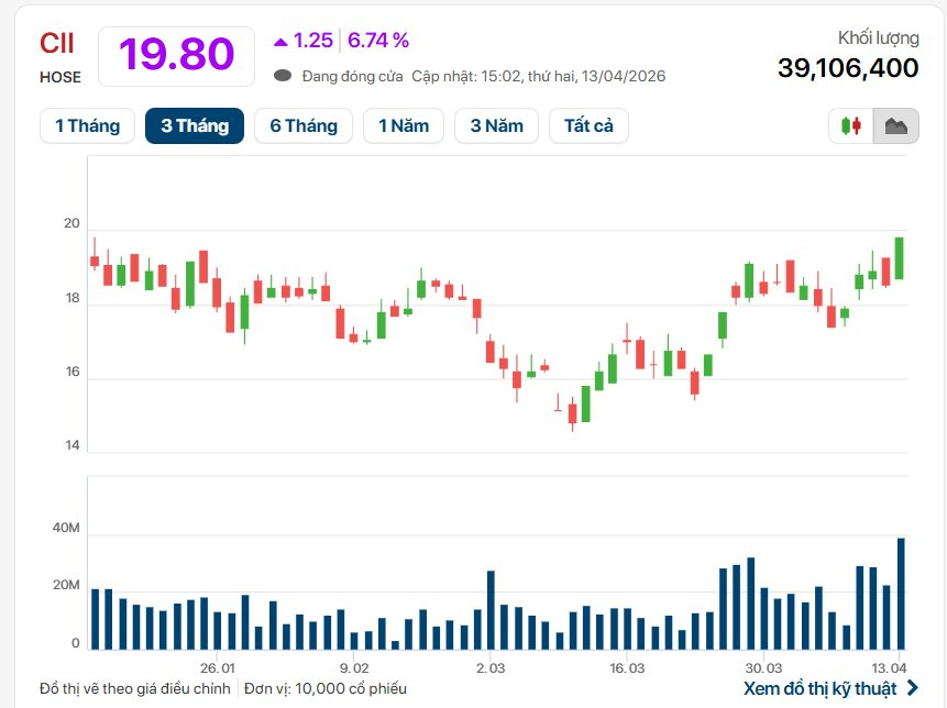Kết phiên 13/4, giá cổ phiếu CII ở mức 19.800 đồng/cổ phiếu, tăng trần 6,74% so với phiên trước, khối lượng cổ phiếu giao dịch khớp lệnh tăng đột biến đạt hơn 39,1 triệu đơn vị.