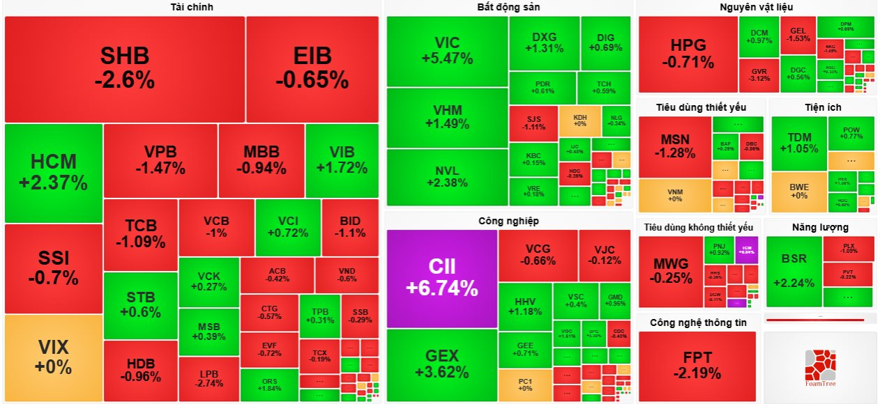 Phiên giao dịch khép lại với sự phân hóa rõ nét, nhưng điểm nhấn vẫn thuộc về dòng tiền mạnh mẽ quay lại nhóm cổ phiếu bất động sản và hạ tầng. Trong đó, cổ phiếu CII và cổ phiếu VIC là tâm điểm nổi bật nhất.