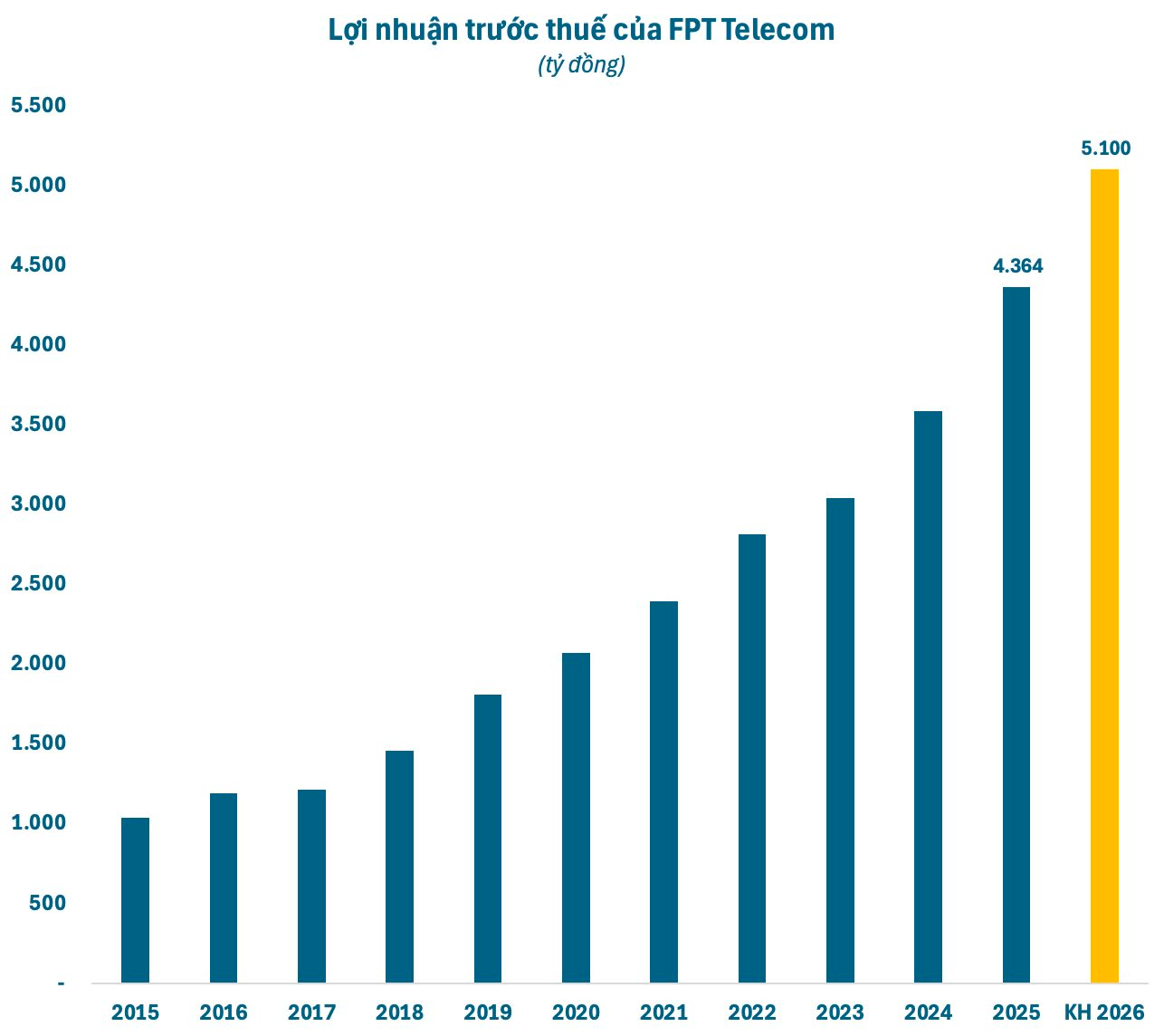 Tại Đại hội, FPT Telecom sẽ trình cổ đông thông qua kế hoạch kinh doanh 2026 với mục tiêu doanh thu đạt 22.000 tỷ đồng và lợi nhuận trước thuế 5.100 tỷ đồng, lần lượt tăng 12,8% và 16,9% so với thực hiện năm trước. Nếu hoàn thành kế hoạch đề ra, Công ty viễn thông này sẽ phá kỷ lục lợi nhuận.