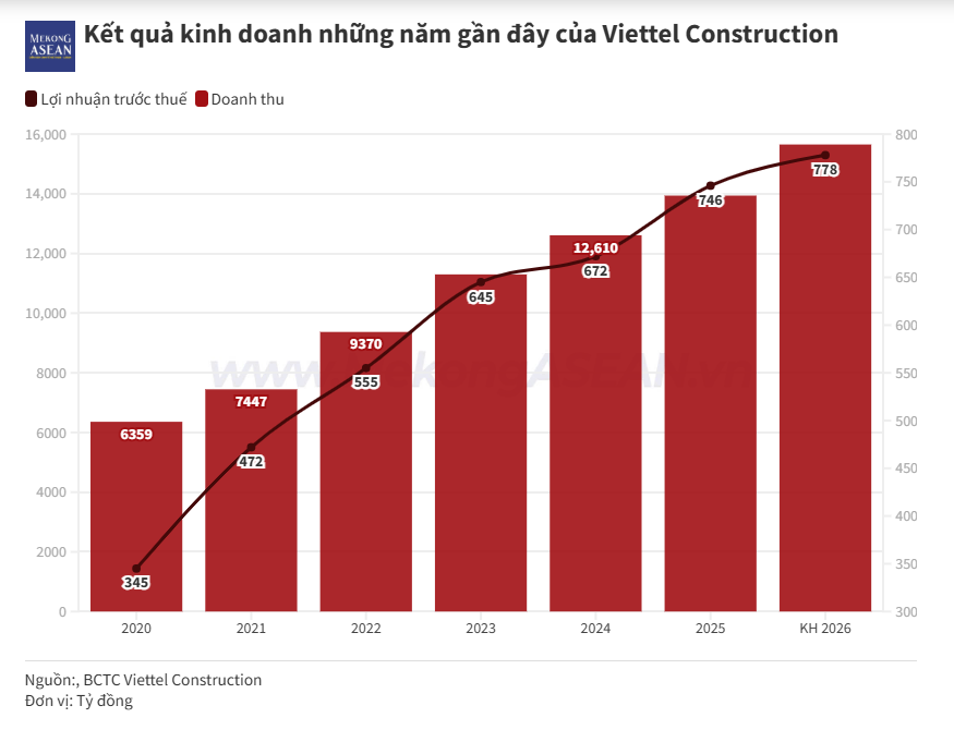 Năm 2026, Viettel Construction đặt mục tiêu doanh thu 15.653 tỷ đồng, tăng 11,4% so với thực hiện năm 2025; lợi nhuận trước thuế đạt 778 tỷ đồng, tăng 4,3%. Nếu hoàn thành, đây sẽ là mức doanh thu và lợi nhuận trước thuế cao nhất từ trước đến nay của doanh nghiệp.