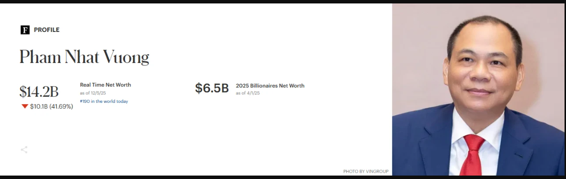 Ngày 5/12/2025, Forbes báo cáo rằng tài sản ròng của ông Phạm Nhật Vượng giảm từ khoảng 24,7 tỷ USD xuống còn 14,2 tỷ USD, tương đương mức giảm hơn 10,1 tỷ USD chỉ trong một ngày.