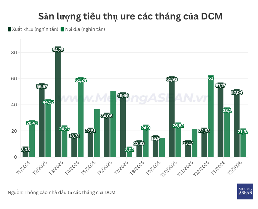 Lũy kế hai tháng đầu năm 2026, tổng lượng ure tiêu thụ của DCM đạt 169.230 tấn, trong đó 60.030 tấn tiêu thụ nội địa, xuất khẩu đạt 109.200 tấn.