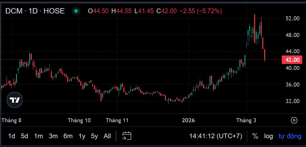 Trên thị trường chứng khoán, từ đầu tháng 1/2026 tới nay, giá cổ phiếu của DCM đã tăng 22%. Chốt phiên 16/3, cổ phiếu DCM ở mức 44.550 đồng/cp, đưa vốn hóa của doanh nghiệp lên 23.584 tỷ đồng.