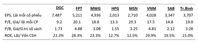 Chỉ số ROE của DGC đạt trên 21%, tương đương mức trung bình của nhóm VN30, nhưng cấu trúc tài chính lành mạnh hơn với tỷ lệ nợ thấp và lượng tiền mặt lớn 13.105 tỷ đồng.