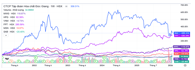 Mặc dù vừa giảm gần 30% trong hơn một tháng, nhưng nếu nhìn trên đồ thị 5 năm, DGC vẫn là một trong những cổ phiếu có mức tăng giá cao nhất trong nhóm VN30, vượt xa nhiều tên tuổi lớn như FPT, HPG, MWG hay MSN.
