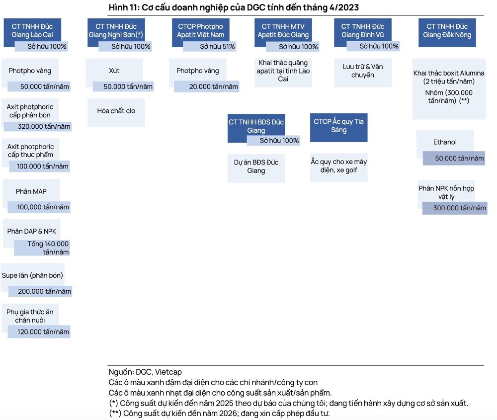 Những năm qua, hệ sinh thái của Hóa chất Đức Giang cũng đã được mở rộng đáng kể, trong đó lớn nhất phải kể đến tổ hợp của công ty con Đức Giang Lào Cai - nơi sản xuất đa dạng P4, axit photphoric, phân bón và phụ gia thức ăn chăn nuôi. Công ty Photpho Apatit Việt Nam (Đức Giang sở hữu 51%) cũng là đơn vị lớn trong mảng sản xuất phốt pho vàng với công suất 20.000 tấn/năm.