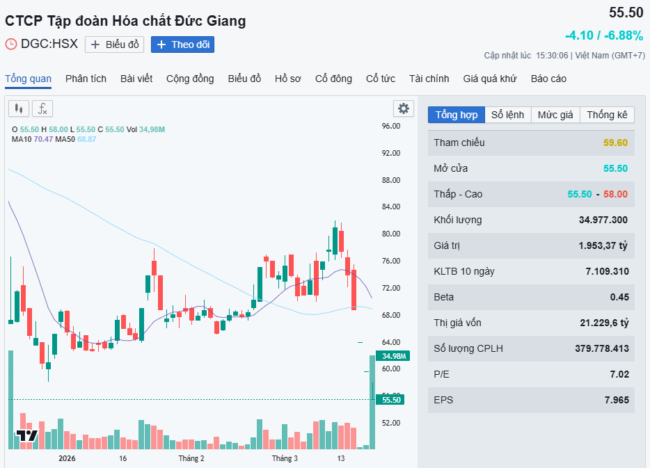 Sau 6 phiên rơi sâu, cổ phiếu DGC đã mất hơn 31% thị giá, vốn hóa thị trường của Hóa chất Đức Giang cũng theo đó “bốc hơi’ gần 10.000 tỷ đồng.