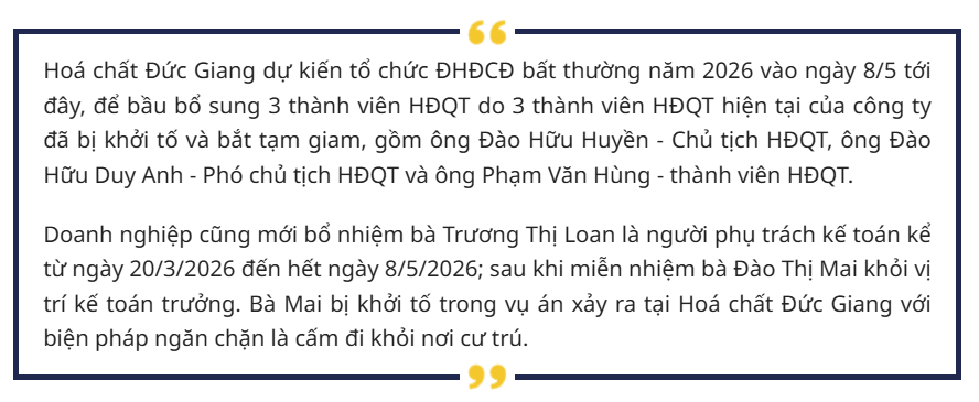 Do nhiều hồ sơ, tài liệu kế toán đang bị niêm phong và thu giữ tại cơ quan điều tra nên Hoá chất Đức Giang chưa thể thực hiện được công tác kiểm toán báo cáo tài chính năm 2025.