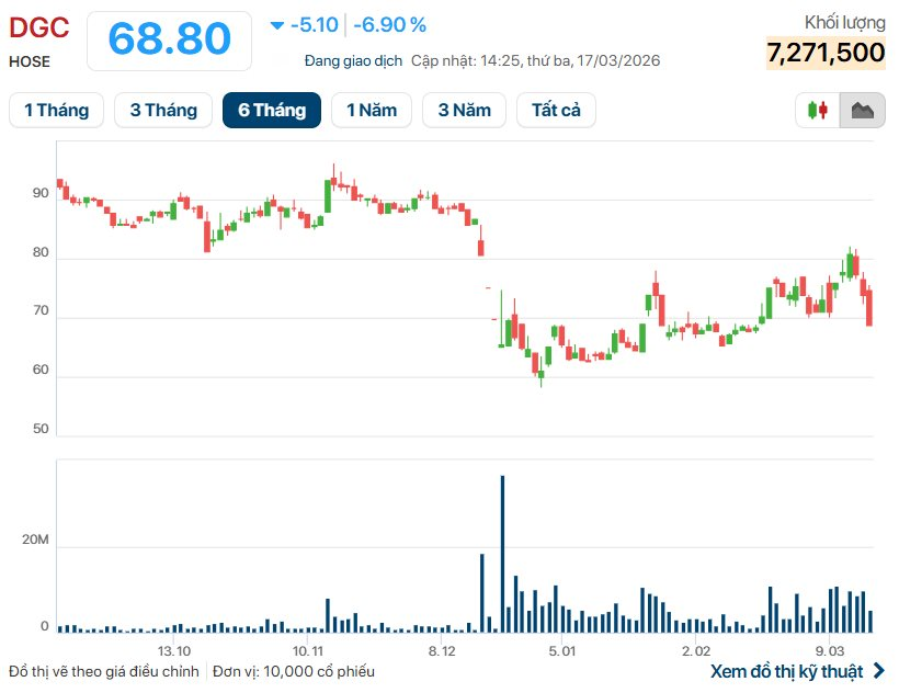 Sau thông tin ông Huyền bị khởi tố, cổ phiếu DGC ngay lập tức giảm sàn. Kết phiên 17/3 ở mức 68.800 đồng/cổ phiếu.