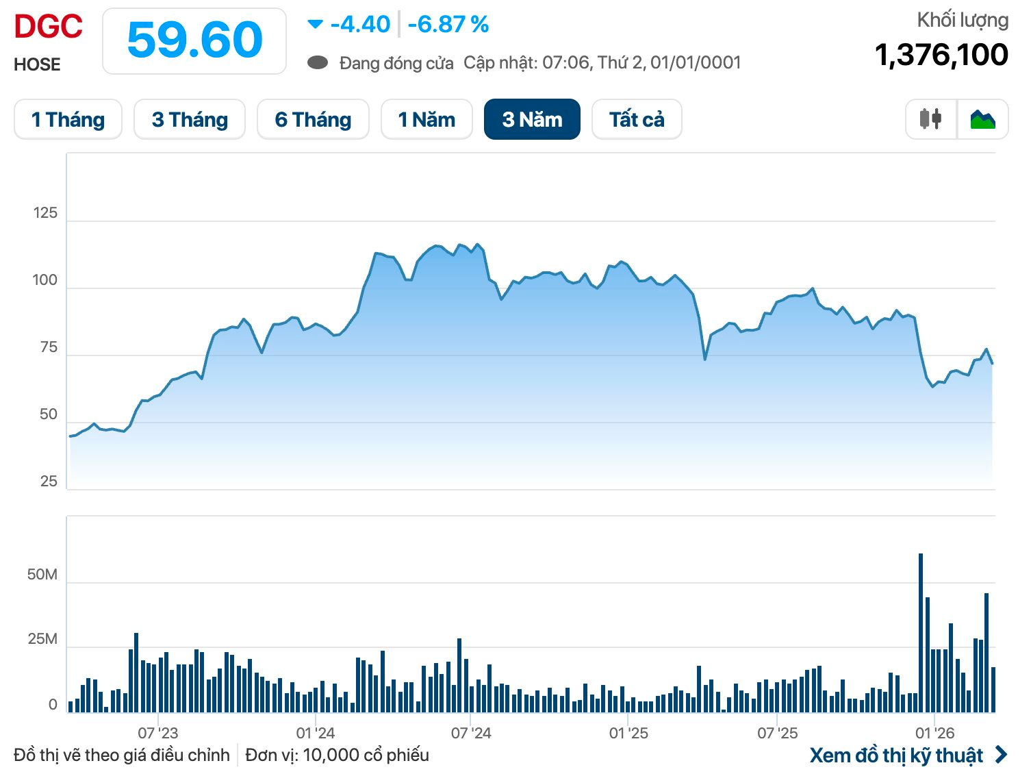 Trên sàn chứng khoán, thông tin tiêu cực này ngay lập tức tác động mạnh đến thị trường, cổ phiếu DGC bị bán tháo trong 3 phiên gần nhất, thị giá liên tục giảm hết biên độ và hiện đã rơi xuống 59.600 đồng/cổ phiếu.