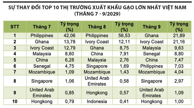 Theo số liệu của Cục Hải quan, trong tháng 9, xuất khẩu gạo chỉ đạt 467.000 tấn, tương đương 232 triệu USD, cùng giảm gần một nửa so với tháng 8. So với cùng kỳ năm ngoái, sản lượng giảm 43,3% và giá trị giảm 54,7%. Riêng sang Philippines, lượng xuất khẩu chỉ còn 32.819 tấn, trị giá 17,56 triệu USD, giảm tới 93,3% về khối lượng và 92,6% về giá trị so với tháng 8. Từ vị trí số 1, Philippines tụt xuống thứ 6, chỉ chiếm 7,03% tỷ trọng (xem bảng).