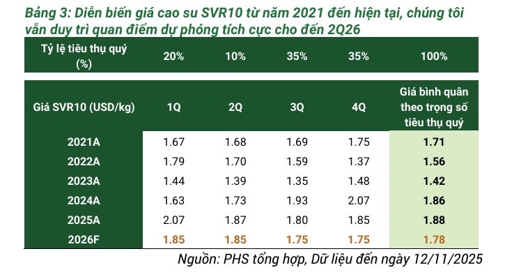 PHS đánh giá tích cực về triển vọng nhóm ngành cao su thiên nhiên giai đoạn quý IV/2025 – FY2027 nhờ 3 yếu tố sau: Thứ nhất, dự phóng giá bán cao su Việt Nam (loại SVR10) sẽ duy trì quanh mức 1,85 USD/kg (tương ứng 49 triệu đồng/tấn) trong giai đoạn quý IV/2025 – quý II/2026, trước khi điều chỉnh nhẹ xuống còn 1,75 USD/kg (46,4 triệu đồng/tấn) cho đến FY27.