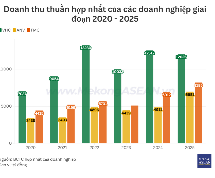 Năm 2025, Vĩnh Hoàn mang về 12.026 tỷ đồng doanh thu thuần, giảm 3,9% so với năm trước. Lợi nhuận sau thuế đạt 1.451 tỷ đồng, tăng 11,3%. Với kết quả này, VHC hoàn thành lần lượt 110% kế hoạch cơ bản về doanh thu và 145% về lợi nhuận.