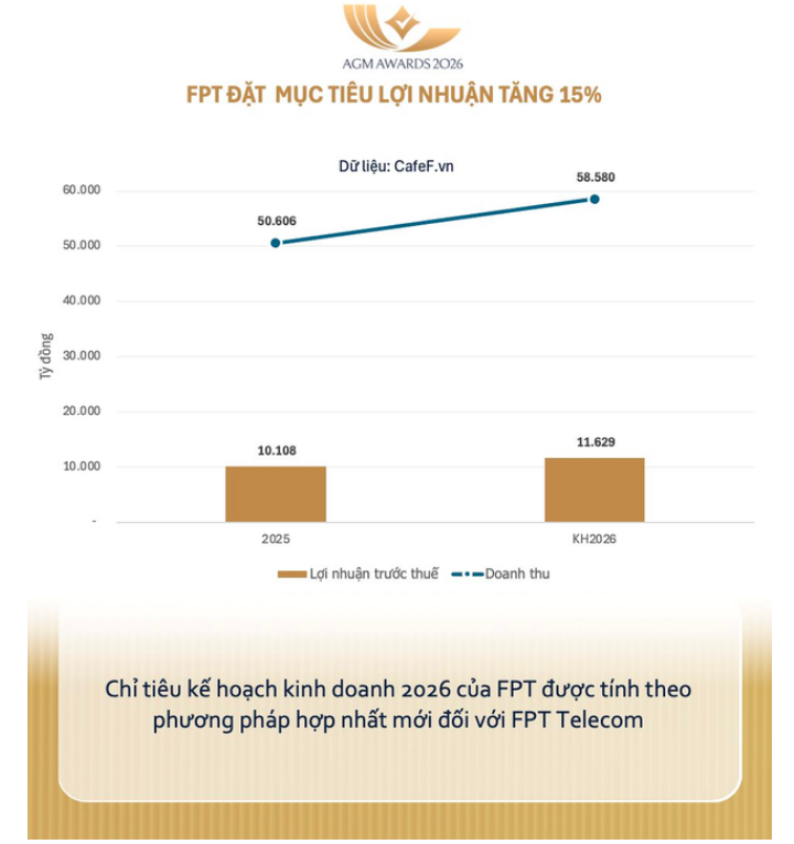 Trong năm 2026, Tập đoàn đặt kế hoạch doanh thu 58.580 tỷ đồng và lợi nhuận trước thuế 11.629 tỷ đồng, tương ứng mức tăng trưởng lần lượt 15,8% và 15% (theo phương pháp hợp nhất mới đối với FPT Telecom).