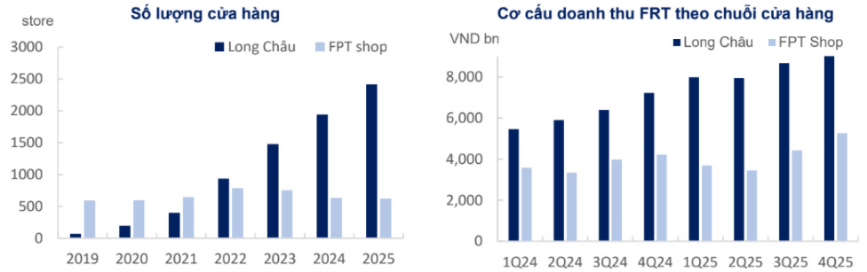 Long Châu tiếp tục giữ vai trò động lực tăng trưởng khi mở rộng nhanh mạng lưới với hơn 571 nhà thuốc và trung tâm tiêm chủng mới trong năm 2025, đồng thời cải thiện hiệu quả hoạt động, qua đó củng cố triển vọng tích cực của cổ phiếu FRT trong giai đoạn 2026–2027.