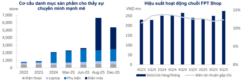 Song song với Long Châu, FPT Shop cũng cho thấy sự phục hồi rõ nét về hiệu quả kinh doanh sau giai đoạn tái cấu trúc. Năm 2025, chuỗi này đạt doanh thu 16.809 tỷ đồng, tăng 11% YoY, hoàn thành 105% kế hoạch và trở lại trạng thái có lãi trong nửa cuối năm. Trong quý IV/2025, doanh thu trung bình mỗi cửa hàng FPT Shop đạt khoảng 2,8 tỷ đồng/tháng, tăng 26% so với cùng kỳ, cho thấy hiệu quả vận hành đang dần được cải thiện.