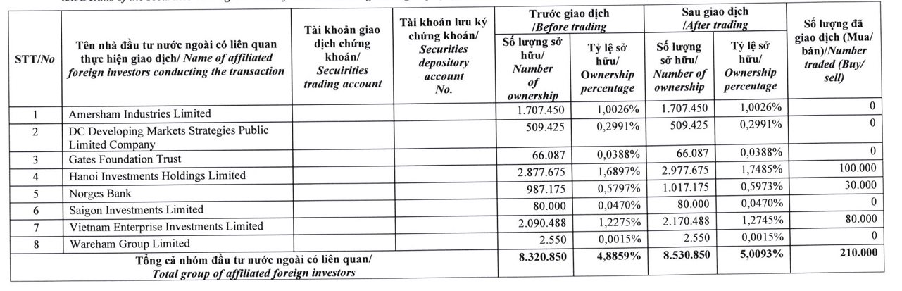 Cụ thể, thông qua các giao dịch ngày 30/03/2026, nhóm quỹ do Dragon Capital quản lý cùng Gates Foundation Trust đã nâng tỷ lệ sở hữu tại doanh nghiệp bán lẻ này vượt ngưỡng 5%. Quỹ Hanoi Investments Holdings Limited mua 100.000 đơn vị, Vietnam Enterprise Investments Limited mua 80.000 đơn vị và Norges Bank mua 30.000 đơn vị.