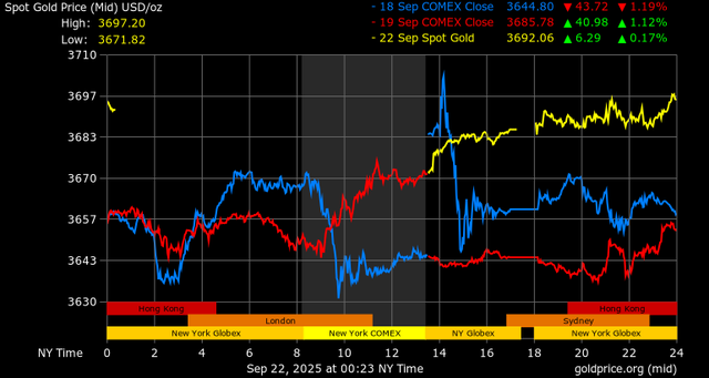 Giá vàng tương lai giao tháng 12/2025 trên sàn Comex New York tăng 27,5 USD, tương ứng tăng 0,75% lên mức 3.705,8 USD/ounce.