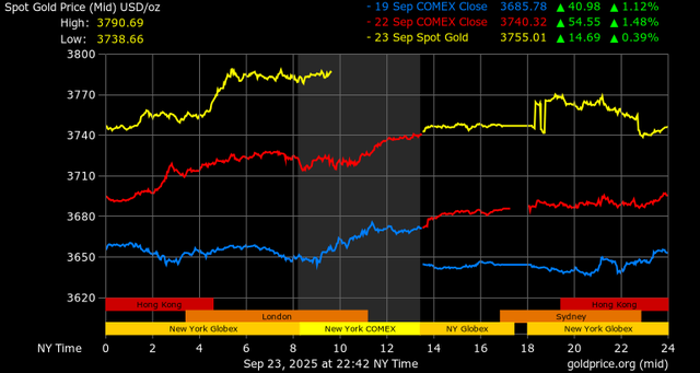 Giá vàng tương lai giao tháng 12/2025 trên sàn Comex New York tăng 40,6 USD, tương ứng tăng 1,08% lên mức 3.815,7 USD/ounce.