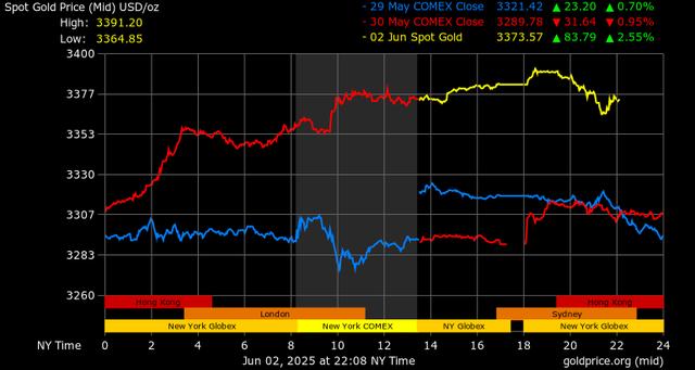 Giá vàng tương lai giao tháng 6/2025 trên sàn Comex New York tăng 81,8 USD, tương ứng tăng 2,47% lên mức 3.397,2 USD/ounce.
