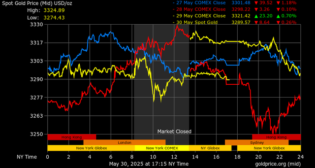 Trên thị trường vàng thế giới, giá vàng giao ngay chốt phiên hôm qua tại Mỹ giảm 27,9 USD xuống 3.289,7 USD/ounce.