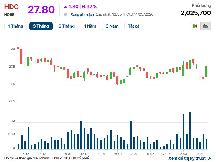 Sau khi thông tin về giao dịch của người liên quan được công bố, cổ phiếu HDG đã tăng kịch trần trong phiên sáng 11/3. Khối lượng giao dịch đạt gần 2 triệu đơn vị, tương ứng giá trị khoảng 54 tỷ đồng.