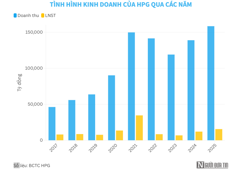 Năm 2025, Hòa Phát ghi nhận doanh thu hợp nhất 158.332 tỷ đồng và lợi nhuận sau thuế 15.515 tỷ đồng, tăng lần lượt 13% và 29% so với năm trước.