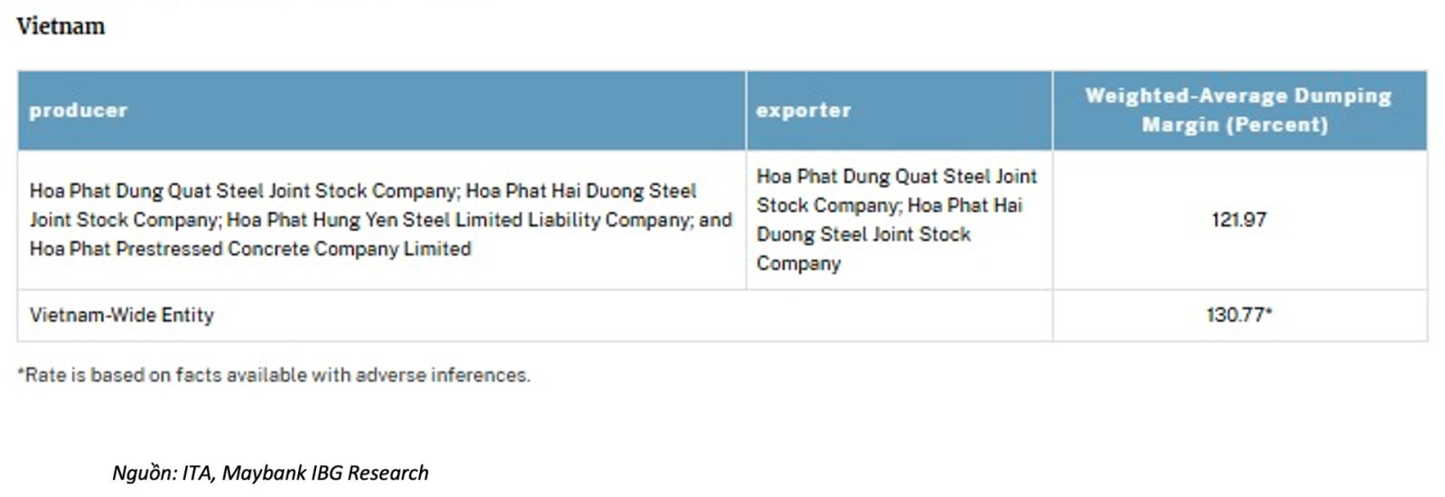 Nhìn chung, Maybank nhận định kết luận sơ bộ của Bộ Thương mại Mỹ chủ yếu mang tính kỹ thuật trong khuôn khổ các biện pháp phòng vệ thương mại, và với quy mô xuất khẩu sang Mỹ không lớn, tác động tổng thể đối với HPG trong ngắn hạn sẽ không đáng kể.
