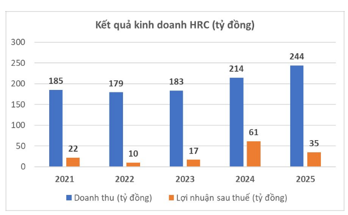 Về kết quả kinh doanh, năm 2025 Cao su Hòa Bình ghi nhận doanh thu đạt 244 tỷ đồng, mức cao nhất kể từ khi doanh nghiệp công bố số liệu. Tuy nhiên, lợi nhuận sau thuế chỉ đạt khoảng 35 tỷ đồng, giảm đáng kể so với mức 61 tỷ đồng của năm trước đó.