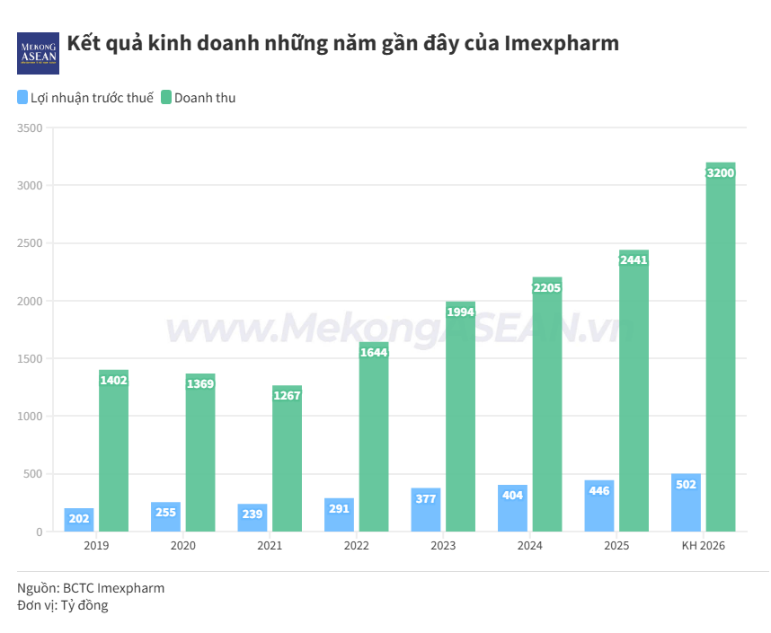 Imexpharm sẽ tổ chức ĐHĐCĐ thường niên năm 2026 vào sáng ngày 22/4 tại số 76 Lê Lai, phường Bến Thành, TP HCM. Theo tài liệu họp ĐHĐCĐ, năm 2026, Imexpharm đặt mục tiêu doanh thu đạt 3.200 tỷ đồng và lợi nhuận trước thuế đạt 502 tỷ đồng, tăng lần lượt 9,8% và 12,6% so với kết quả thực hiện năm 2025. Nếu hoàn thành, đây sẽ là mức doanh thu và lợi nhuận trước thuế cao nhất từ trước đến nay của doanh nghiệp.