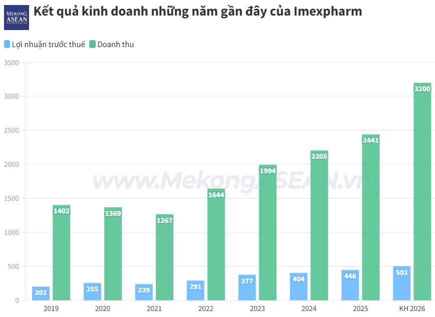 Imexpharm sẽ tổ chức ĐHĐCĐ thường niên năm 2026 vào sáng ngày 22/4 tại số 76 Lê Lai, phường Bến Thành, TP HCM. Theo tài liệu họp ĐHĐCĐ, năm 2026, Imexpharm đặt mục tiêu doanh thu đạt 3.200 tỷ đồng và lợi nhuận trước thuế đạt 502 tỷ đồng, tăng lần lượt 9,8% và 12,6% so với kết quả thực hiện năm 2025. Nếu hoàn thành, đây sẽ là mức doanh thu và lợi nhuận trước thuế cao nhất từ trước đến nay của doanh nghiệp.