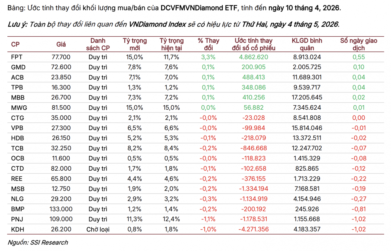 Trên cơ sở các thay đổi dự kiến trong danh mục, hoạt động tái cơ cấu của các ETF theo dõi chỉ số VNDiamond nhiều khả năng sẽ tập trung vào một số cổ phiếu nhất định. Cụ thể, nhóm cổ phiếu được dự báo mua vào mạnh bao gồm FPT với khối lượng khoảng 4,9 triệu cổ phiếu; ACB khoảng 0,5 triệu cổ phiếu và MBB khoảng 0,4 triệu cổ phiếu. Ngược lại, các cổ phiếu có thể chịu áp lực bán ra lớn nhất gồm KDH, NLG và MSB./.