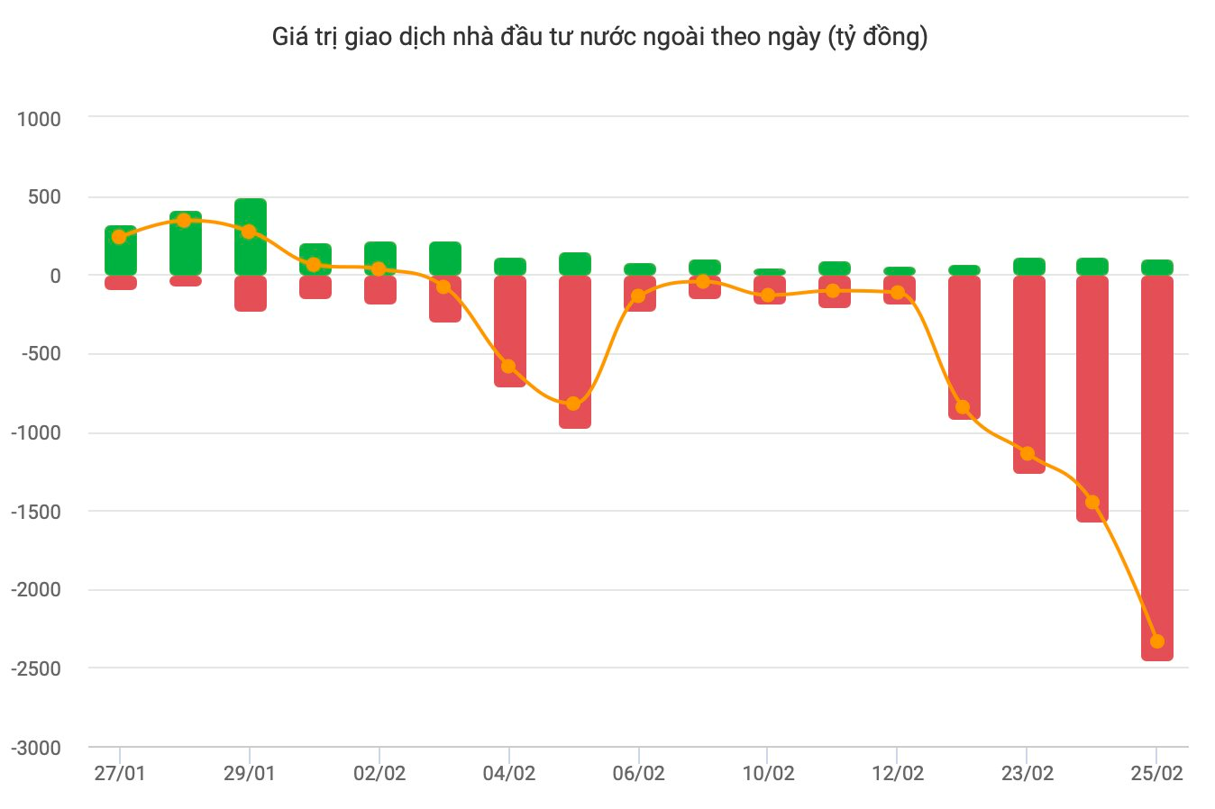 Đáng chú ý, càng giảm thanh khoản càng lớn. Khối lượng giao dịch phiên 25/2 vừa qua thậm chí còn lên đến gần 48 triệu cổ phiếu, mức kỷ lục từ khi FPT niêm yết. Lực bán chủ yếu đến từ khối ngoại với khối lượng bán ròng gần 26 triệu đơn vị (giá trị khoảng 2.400 tỷ đồng). Đây cũng là con số chưa từng có trong lịch sử cổ phiếu này.