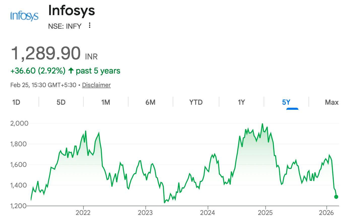 Thực tế cho thấy, không chỉ riêng FPT, cổ phiếu Infosys - công ty "Outsourcing" lớn nhất thế giới, cũng đang đứng trước mỗi đe doạ lớn từ AI. Cổ phiếu này liên tục giảm sâu và hiện đã rơi xuống mức thấp nhất kể từ giữa năm 2023.