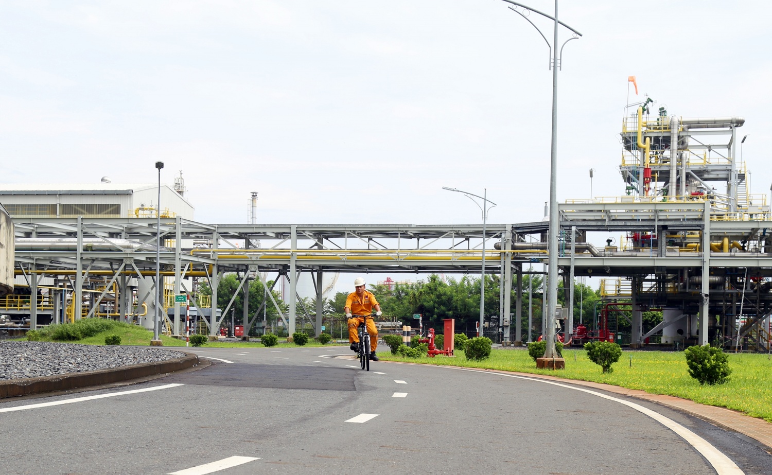 Điều gây ngạc nhiên nhất cho bất kỳ ai lần đầu tới đây là khác với hình dung về sự ồn ào, náo nhiệt thường thấy của các dự án công nghiệp, không gian lại hoàn toàn tĩnh lặng và yên ả. Không có tiếng búa máy, không có tiếng hô hào của hàng trăm công nhân. Thi thoảng, chúng tôi mới bắt gặp bóng dáng màu vàng đặc trưng của trang phục bảo hộ lao động, đó là những kỹ sư vận hành đang đạp xe tuần tra hoặc lặng lẽ kiểm tra thông số tại các cụm van.
