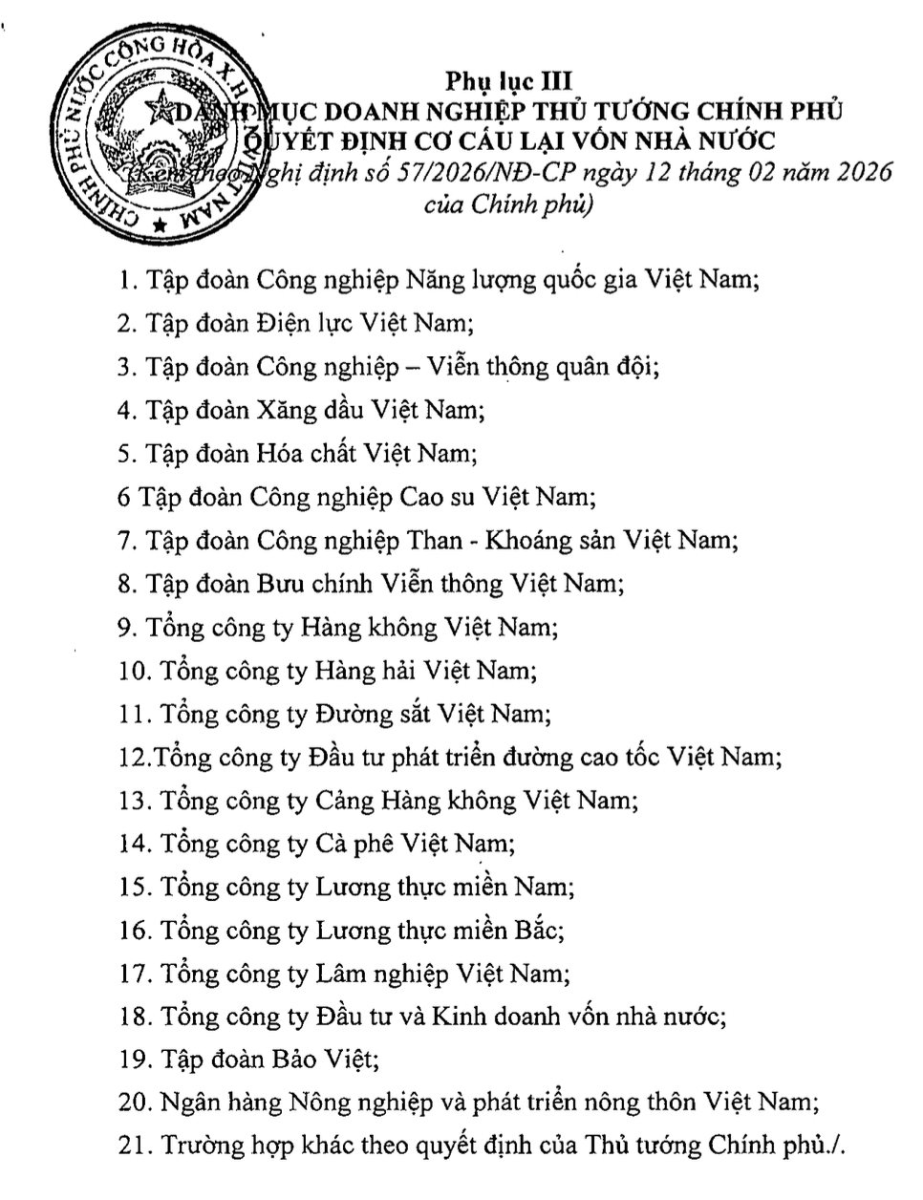 Trước đó, Nghị quyết 79-NQ/TW ngày 06/01/2026 của Bộ Chính trị về phát triển kinh tế nhà nước, đóng vai trò chủ đạo, dẫn dắt trong kỷ nguyên vươn mình, xác định 05 quan điểm chỉ đạo và mục tiêu đến năm 2030, tầm nhìn 2045. Nghị định 57/2026/NĐ-CP là một bước ngoặt mở ra khả năng đẩy nhanh quá trình cơ cấu vốn và cổ phần hóa nhiều doanh nghiệp Nhà nước.