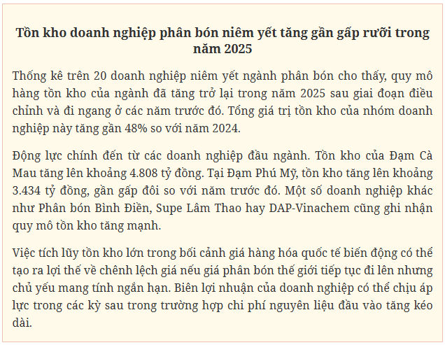 Theo báo cáo tài chính năm 2025, giá trị hàng tồn kho của hai "ông lớn" trong ngành phân bón là Tổng Công ty Phân bón và Hóa chất Dầu khí - CTCP (Đạm Phú Mỹ) và Tổng Công ty Phân bón Dầu khí Cà Mau (Đạm Cà Mau) đều tăng mạnh. Trong đó, Đạm Phú Mỹ nâng giá trị tồn kho cuối năm 2025 lên hơn 3.400 tỷ đồng, gần gấp đôi so với đầu năm. Đạm Cà Mau ghi nhận tồn kho gần 4.800 tỷ đồng, tăng hơn 60%.