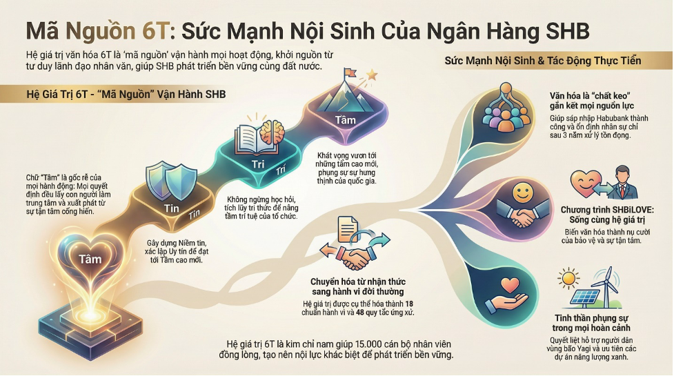 Từ mỗi giá trị hình thành các chuẩn hành vi, giúp người SHB biến niềm tin thành hành động, biến từng giá trị thành cách sống mỗi ngày. Nếu tư duy của người dẫn dắt được xem là điểm khởi đầu thì hệ giá trị sáu chữ T chính là sự kết tinh hoàn hảo nhất của dòng chảy tư tưởng ấy. 6T được xác lập như mã nguồn vận hành mọi hoạt động của tổ chức.