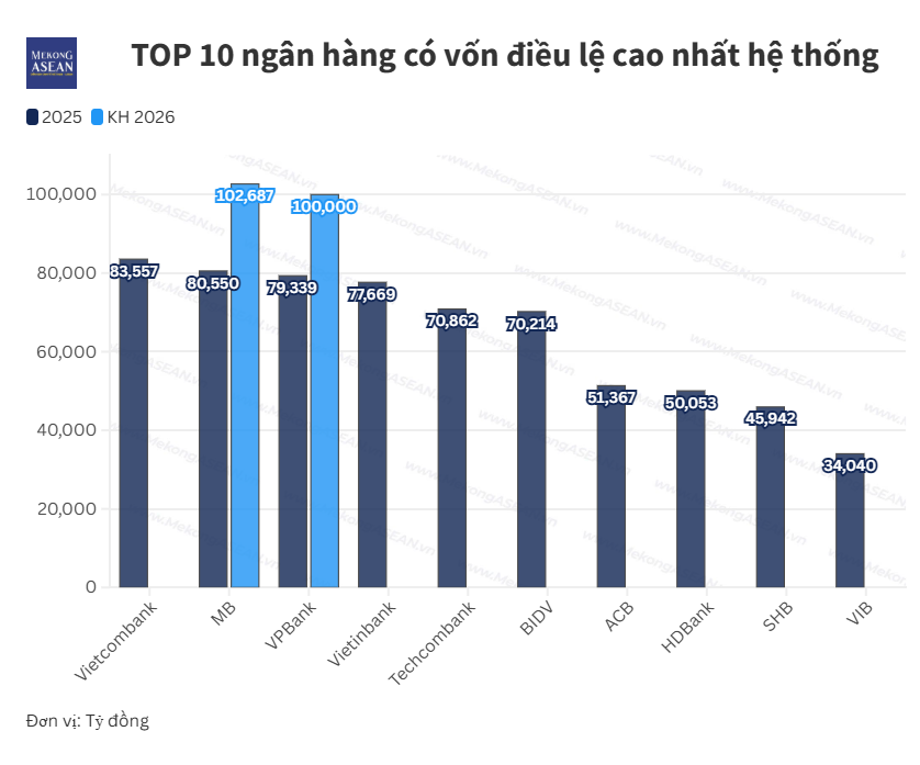 Tài liệu MB cũng công bố kế hoạch tăng vốn điều lệ lên tối đa 102.687 tỷ đồng, tương đương tăng 27,5% so với mức hiện tại 80.550 tỷ đồng. Nếu hoàn thành, đây sẽ là mức vốn điều lệ cao nhất hệ thống ngân hàng. MB trở thành ngân hàng thứ hai lên kế hoạch vượt mốc 100.000 tỷ đồng, sau VPBank – nhà băng cũng đang đặt mục tiêu đạt quy mô vốn này trong năm nay.