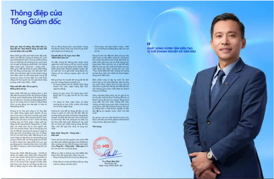 Chia sẻ trong báo cáo thường niên, Tổng giám đốc Ngân hàng TMCP Quân đội (MB) Phạm Như Ánh, cho biết năm 2025 là một trong những năm thành công nhất trong gần 30 năm phát triển của ngân hàng, khi MB không chỉ vượt qua thách thức thị trường mà còn thiết lập nhiều kỷ lục mới.