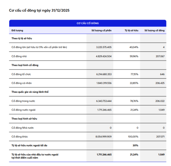 Trong cơ cấu cổ đông, nhóm nhà đầu tư nhỏ áp đảo về số lượng với 207.067 cổ đông, nắm giữ 59,96% vốn điều lệ.