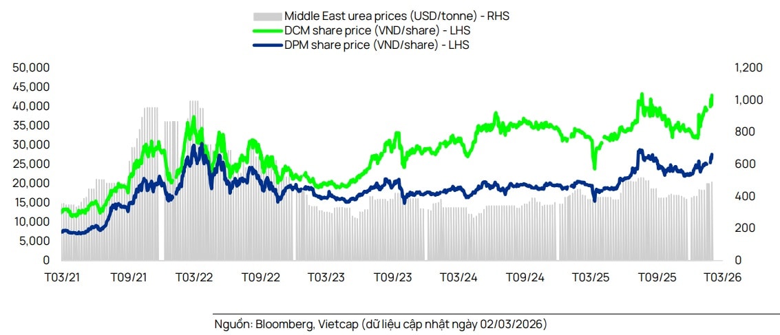 Với kỳ vọng giá urê Trung Đông sẽ đạt đỉnh trong năm 2026, sau đó giảm YoY trong năm 2027 khi căng thẳng địa chính trị hạ nhiệt, nhóm cổ phiếu ngành phân bón được nâng giá mục tiêu.