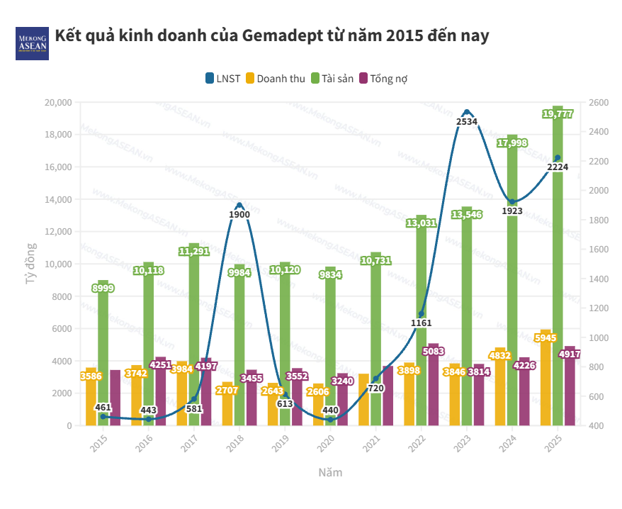 Sau khi trừ các chi phí khác, GMD báo lãi sau thuế năm 2025 đạt 2.224 tỷ đồng, tăng hơn 15% so với năm trước. Dù vẫn thấp hơn 12% so với đỉnh lợi nhuận 2.534 tỷ đồng tại năm 2023, kết quả này vẫn cao vượt trội so với các năm khác.
